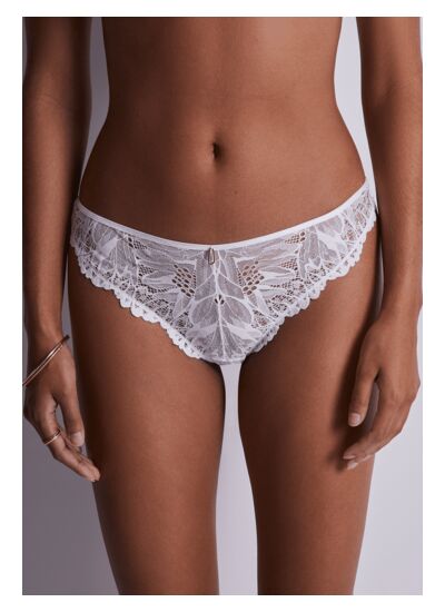 Flowermania, la ligne séduction éco-conçue à porter au gré de vos envies. La dentelle au dessin fl oral exotique est jouée en contraste avec un tulle transparent. Un bijou épuré et visuel orne les formes de la ligne, et une bande guipure apporte la touche d’audace. Une approche éco-responsable avec dentelle et guipure recyclées.