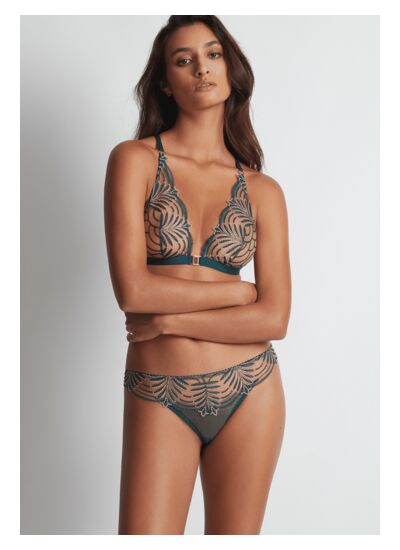 Hypnolove met en lumière une broderie graphique et luxueuse, sublimée par de nombreux détails raffinés. La broderie exceptionnelle est entremêlée d’un fi l lurex doré pour affi rmer son pouvoir de séduction. Sensuelle grâce à un départ de bretelle fantaisie agrémenté d’anneaux dorés, Hypnolove vous offre un entregorge sexy avec un bijou réhaussé d’un joli noeud. En dernière touche mutine, les dos des slips sont habillés de liens à l’esprit bondage sensuel.