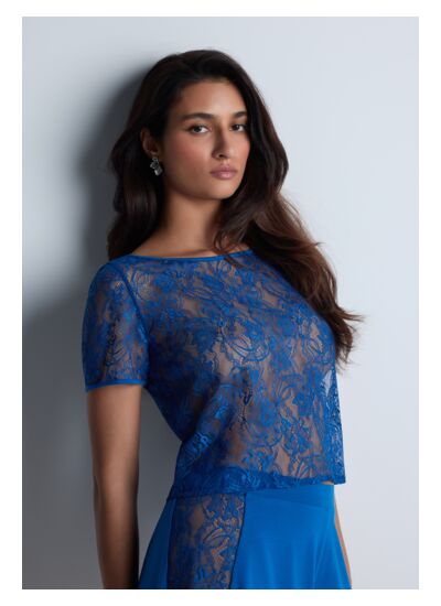 Ce top est-il disponible en plusieurs couleurs ? Ce modèle est proposé dans un bleu profond, une teinte facile à associer et idéale pour un style à la fois chic et décontracté.