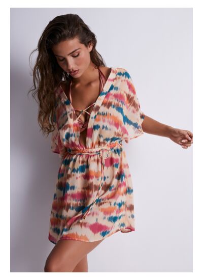 Comment porter la tunique Evening Sand pour un look polyvalent ? Elle se porte aussi bien en journée, par-dessus un maillot de bain, qu’en soirée, associée à des bijoux et des talons pour une allure sophistiquée et sans effort.