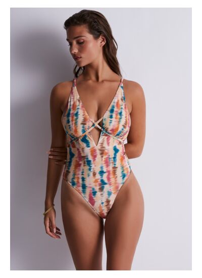 Bohème et séduisante, la ligne Mystic Soul associe un imprimé tie and dye à des détails de liens sexy dans une matière respectueuse de l’environnement. Ligne de plein été par excellence, Mystic Soul mise sur des formes sexy et légères avec des jeux de liens ornés de perles dorées. Les tonalités chaudes de l’imprimé sauront sublimer votre bronzage