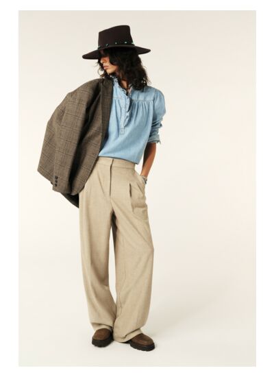 La blouse LILAC est une petite merveille de style. Les manches sont longues, froncées aux épaules et resserrées aux poignets pour donner un effet volanté très chic. Le col est haut rond et volanté également. Elle se ferme avec quelques boutons sur la poitrine, pour un style strict ou plus glamour lorsquils sont ouvert. On adore les fronces au niveau des pièces sur le haut de la poitrine qui donnent du volume à la pièce. A marier avec un pantalon taille haute, légèrement rentré ou avec une jupe crayon pour un style working girl ultra élégant.