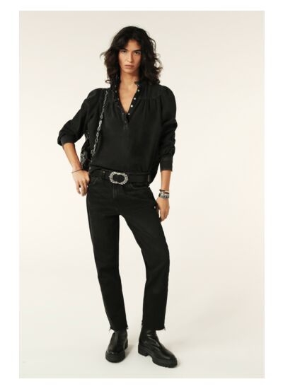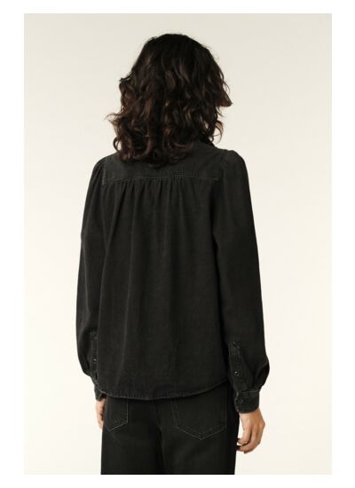 La blouse MILAC est une vraie merveille. Elle allie élégance et originalité avec brio. 100% coton, elle nest pas sans rappeler les chemises denim, mais avec une différence très notable, son style blouse très glamour. Manches longues, col haut volanté, rangée de boutons pression, fronces aux épaules pour donner plus de volume, elle est simplement incroyable. On adore lempiècement sur le haut du buste et les poignets qui sont des rappels des chemises en jean. A matcher avec un pantalon taille haute ou une jupe.
