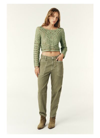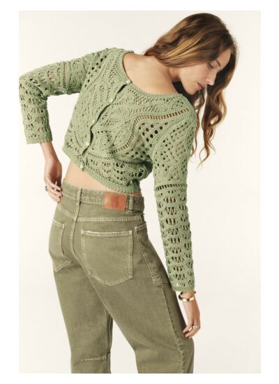Le gilet MARC se démarque par son esprit romantique. Ce cardigan manches longues présente une maille ajourée façon dentelle créant un rendu graphique raffiné. Pourvu de manches longues et dune encolure arrondie, il se ferme par une rangée de boutons ton sur ton au dos pour un style glamour. Avec sa coupe cropée, il sassocie parfaitement avec un pantalon, un short ou une jupe en fonction de nos envies du moment.