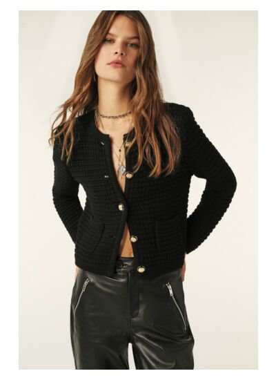Le gilet GASPARD est un modèle qui se porte comme une veste. Il propose un col rond et des manches longues qui laissent apparaître les poignets. Coupe courte, il arbore un point ottoman fantaisie texturé pour un effet tweed. Il se ferme avec de boutons dorés et noirs, et, détail qui tue, il a des poches ! On le porte avec une tenue décontractée ou chic, il sera toujours parfait !