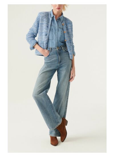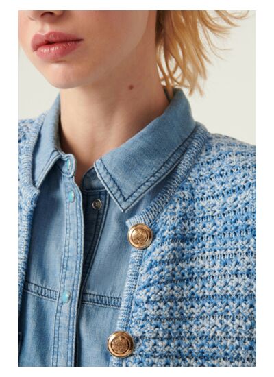 Le gilet GUSPA allie chic et confort pour un look impeccable. Ce cardigan court à manches longues, boutonné tout du long, se pare dun petit col rond, dune coupe ajustée dinspiration veste et de petites poches plaquées sur le devant. Elle sanime dun point fantaisie dans un coton bicolore qui lui apporte un effet tweed. Le détail qui change tout ? Les larges boutons en métal doré, ornés dun blason intriqué autour du B de la maison. Un gilet élégant qui viendra upgrader un jean pour un look pointu.