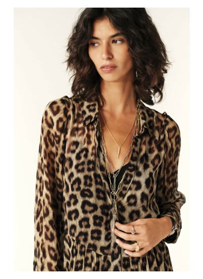 La robe FUSION est un modèle court, très glamour qui ne passera pas inaperçu. Coupe loose en Georgette imprimés léopard, elle propose des découpes sur la partie jupe et des fronces pour un style original. On notera la présente dune très grande patte de boutonnage à lavant, façon chemise, qui donne du caractère à la pièce. On la porte jambes nues lété, avec les collants en hiver ou même superposée à un jean, elle sera toujours parfaite !
