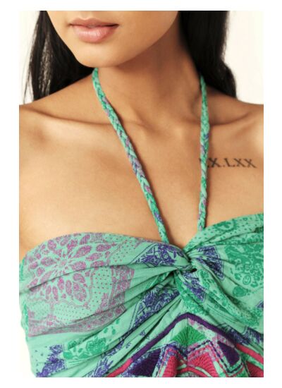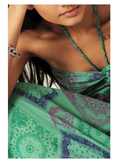 La robe MALY incarne un hymne au voyage et à la féminité. Cette robe longue bustier, en voile de coton imprimé mandala, sorne dun drapée sur la poitrine et se noue autour du cou avec un lien tressé à la main. La taille est marquée par un empiècement entièrement rebrodé à la main dune frise ethnique. Cette pièce vaporeuse et bohème sassocie à merveille avec des sandales et des accumaltions de bracelets en argent, ajoutant ainsi une touche délégance et de sophistication à votre tenue.
