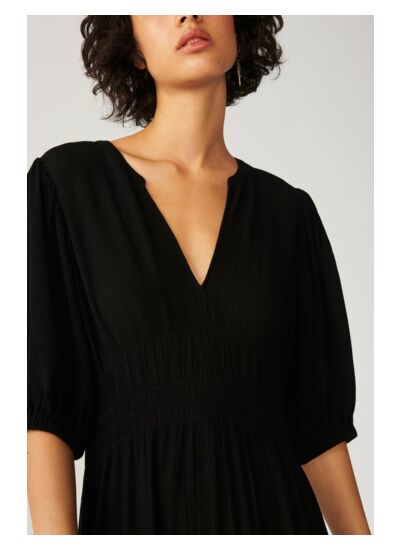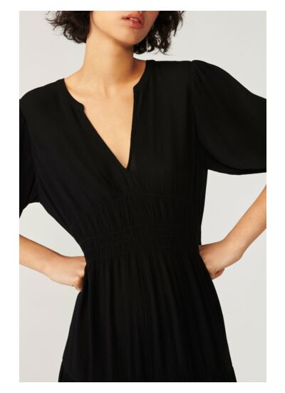 La robe NORMA ba&sh souligne avec grâce une féminité assumée. Cette robe midi opte pour un col rond et des manches courtes élastiquées au bas. Elle est confectionnée dans un tissu légèrement texturé, agrémenté de fils élastiques à la taille pour sajuster parfaitement sur les hanches et flatter la silhouette. On note les découpes froncées sur la jupe, qui lui confèrent un beau mouvement. Le petit plus ? La longue goutte au dos, fermée par un petit bouton et une loupe. Une robe ultra-féminine, idéale avec des talons.