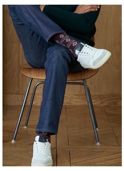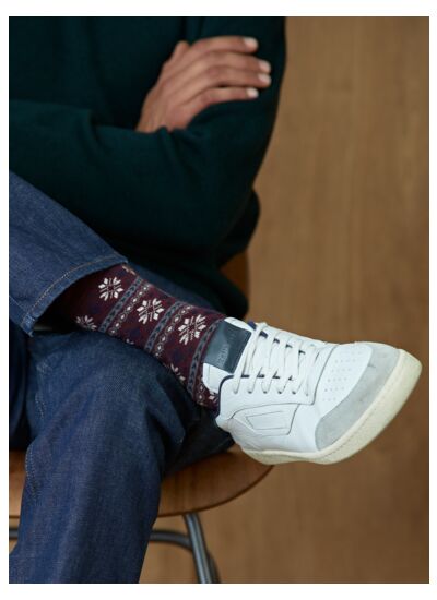 Confortables et colorées, les chaussettes mi-hautes Billy sont renforcées au niveau de la pointe et du talon. Elles sont déclinées dans un motif jacquard sur fond bordeaux. FABRICATION VERTUEUSE : FABRICATION FRANÃAISE : La fabrication française de cette pièce sâinscrit dans une démarche responsable entreprise avec nos ateliers et fournisseurs depuis 2011. OEKOTEX STANDARD 100 : Système de référence, ce label international contrôle la traçabilité et certifie lâabsence de substances nocives dans les textiles. COMMENT L'ASSOCIER ? Aucune règle en période de fêtes, l'important est de s'amuser avec les couleurs et styles pour une allure à la hauteur des évènements.