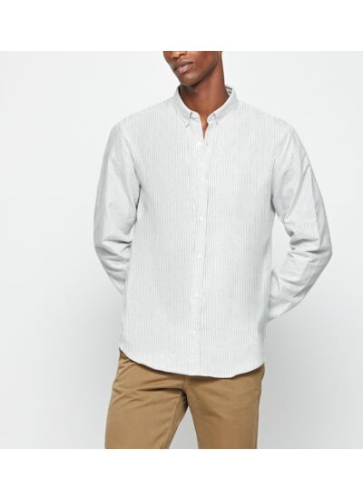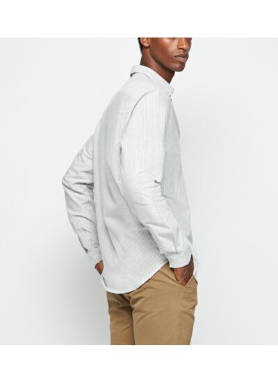 Fin XIXème siècle : les Anglais stationnés en Inde découvrent la chemise Oxford en jouant au polo. Son tissu respirant, sa fonctionnalité et son confort l'introduisent rapidement aux États-Unis. Emblème du look Ivy League puis preppy, c'est aujourd'hui le must-have absolu de la garde-robe masculine contemporaine. Coton sourcé au Portugal. FABRICATION VERTUEUSE : RESPECT DES NORMES GOTS : Fabriqué dans le respect des normes environnementales GOTS (Global Organic Textile Standard). Cette certification comprend l’exclusion de tout composant toxique chimique dangereux pour l’environnement et la santé (chlore, métaux lourds, agents cancérigènes). Les exigences sur la biodégradabilité et l’élimination des déchets sont aussi contrôlées ainsi que des critères sociaux. COMMENT L'ASSOCIER ? Flatteur, l'écru en hiver est facile à porter. Et quoi de mieux qu'un chino beige ou khaki pour le valoriser ? Claudio mesure 1m89 et porte une taille L.