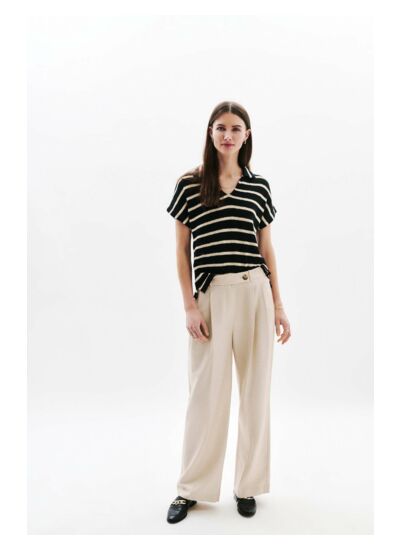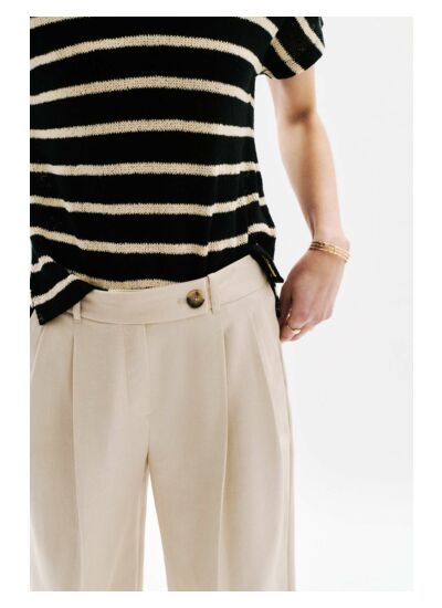 Le pantalon Pvoile, nouveauté de la saison, se distingue par sa coupe large. Confectionné en mélange de lin, il vous assure fraîcheur et confort. Son design plissé ajoute une touche originale à votre tenue. Élégant pour toutes occasions. - Pantalon - Coupe large - Longueur 108 cm pour une taille 38 - Tailles du 34 au 44 Idées look - Le pantalon Pvoile se marie bien avec un haut à rayures et des mocassins pour une allure sophistiquée. - Ce pantalon large peut être porté avec un chemisier fluide et des escarpins pour une allure élégante au bureau. Conseil entretien Pour préserver la qualité de votre pantalon et prolonger sa durée de vie, le nettoyage à sec par un professionnel en pressing est très fortement recommandé. Toutefois, vous pouvez également opter pour un lavage à 30°C en cycle délicat. Le repassage est possible : il est recommandé à basse température (maximum 110°) et sans vapeur. Il est interdit d'utiliser le sèche-linge.