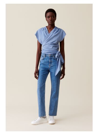 Elle se marie parfaitement avec un pantalon tailleur pour un style chic ou un jean pour une allure décontractée. Son design cache-cœur souligne la silhouette tout en restant facile à porter.