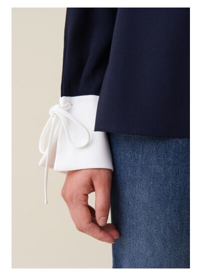 Blouse fluide marine avec col chemise contrasté ouvert à rabats et bouton