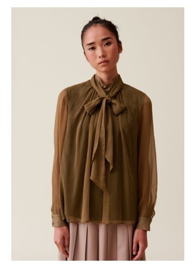 Blouse jaune fluide à manches longues avec motifs carreaux et col lavallière