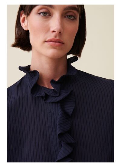 Blouse droite bleu foncé à rayures verticales avec col doublement volanté et patte de boutonnage cachée