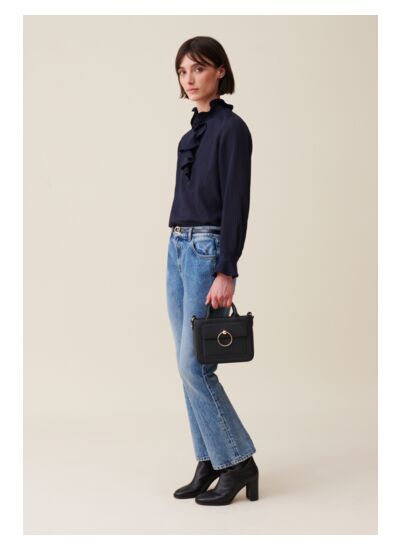 Cette blouse rayée Claudie Pierlot est-elle adaptée pour un look professionnel ? Oui, son design élégant avec volants et rayures bleu foncé apporte une touche sophistiquée tout en restant sobre, idéale pour un style professionnel moderne et féminin.