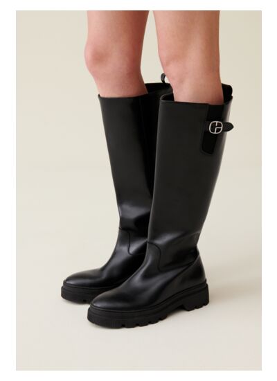 Bottes noires hautes en cuir lisse avec bout arrondi et semelle épaisse