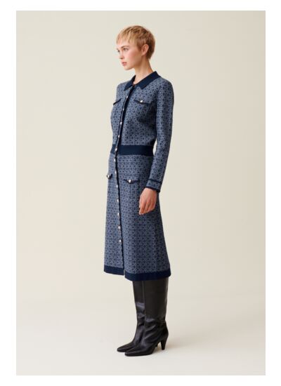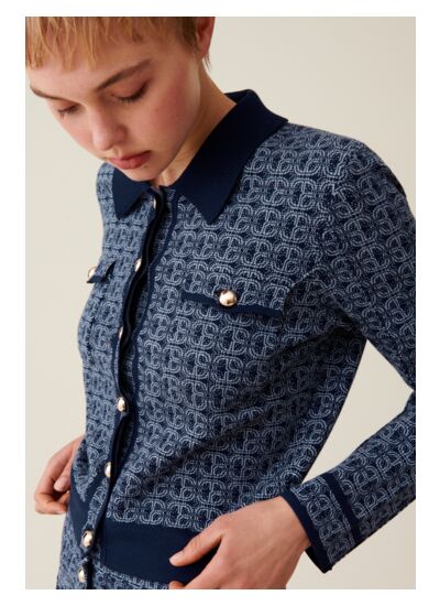 Cardigan monogrammé CP avec col chemise bleu et détails contrastés