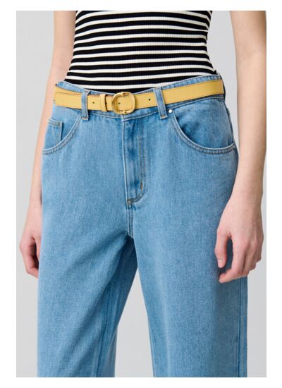 Cette ceinture convient-elle à un style formel ou décontracté ? Sa finition en cuir et sa boucle dorée apportent une touche chic polyvalente, idéale pour sublimer aussi bien une tenue formelle qu’un look casual.