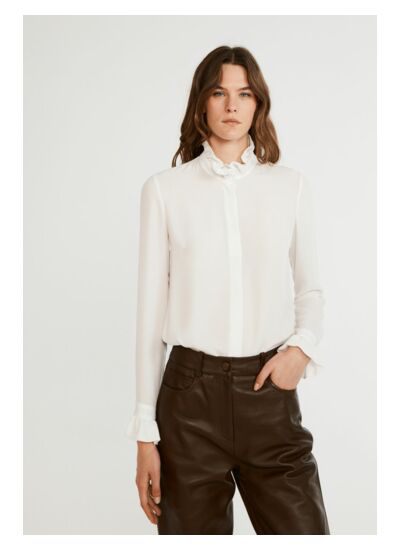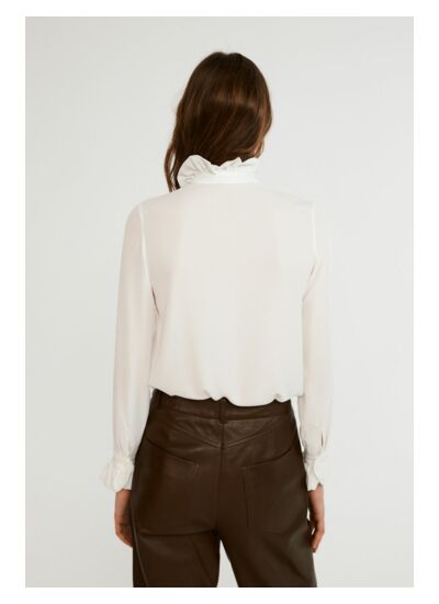 Avec quels styles peut-on associer cette chemise écrue ? Son col victorien apporte une touche sophistiquée, idéale à porter avec un pantalon tailleur, une jupe crayon ou sous un blazer pour un look professionnel ou casual chic.