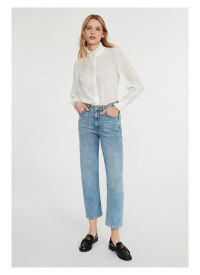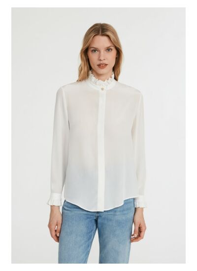 Avec quelles pièces associer cette chemise blanche à col montant ondulé ? Elle s’adapte parfaitement à un pantalon tailleur pour un style chic et professionnel, mais aussi à un jean pour une allure casual soignée. Son col original met en valeur un visage et peut être sublimé par des accessoires minimalistes.
