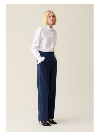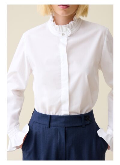 Chemise blanche en coton avec col volanté et froncé et patte de boutonnage cachée