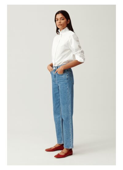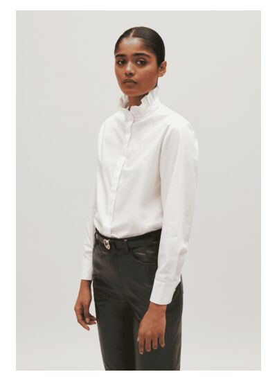 Chemise en coton à col victorien montant à volants Coupe droite et porté légèrement oversizedFermeture boutonnée à patte de boutonnage recouverte, manches longues à boutons aux poignets