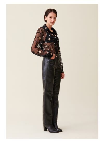 Chemise noire transparente brodée avec motif floral, à col chemise et patte de boutonnage visible avec boutons nacrés