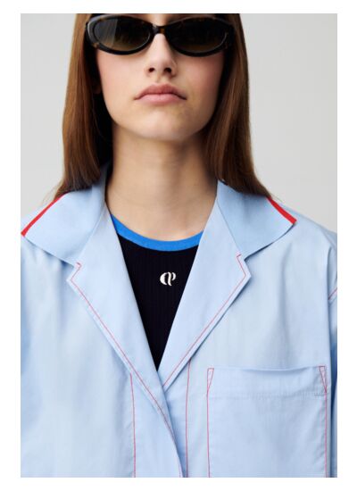 - Surpiqûres contrastées au niveau du col, de la patte de boutonnage, en bas de manches et autour de la poche poitrine
