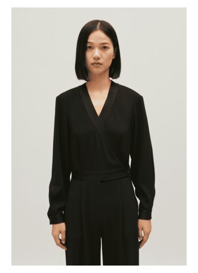 Décolleté croisé, manches blousantes, 2 poches italiennes côtés et 2 poches passepoilées au dos