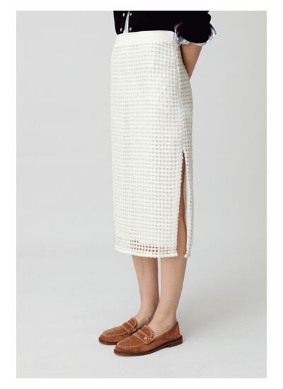 Jupe en crochet avec sequins et finitions côtelées, coupe droite avec doublure