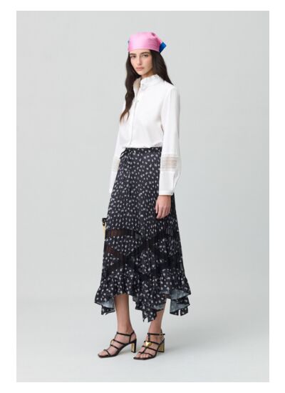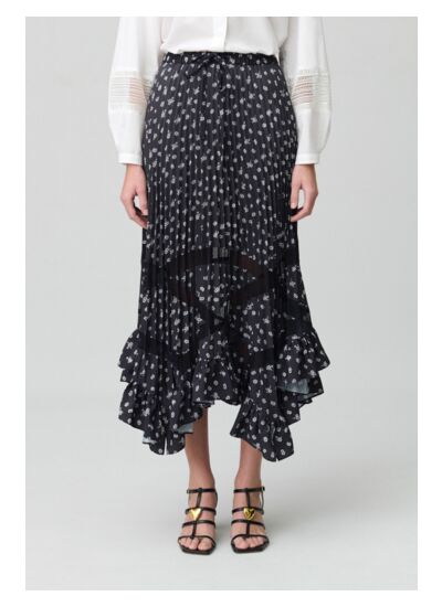 Jupe midi plissée asymétrique avec motif foncé floral et empiècements en dentelle transparente
