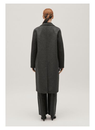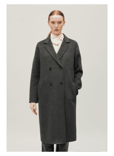 Le manteau est conçu en laine double face, garantissant à la fois chaleur et résistance, avec une finition gris chiné qui apporte une touche moderne et sophistiquée.