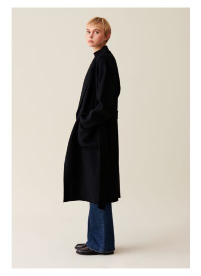 Manteau en maille esprit peignoir noir avec col tailleur et ceinture amovible à nouer