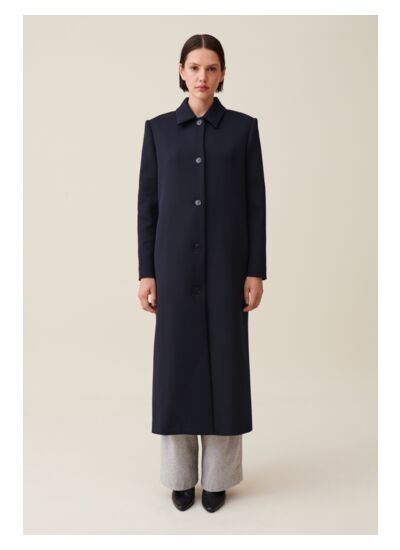 Manteau long bleu à coupe droite avec col chemise et manches longues
