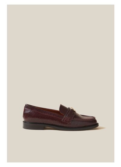 Mocassins bordeaux en cuir effet serpent, boucle dorée monogramme CP et petit talon