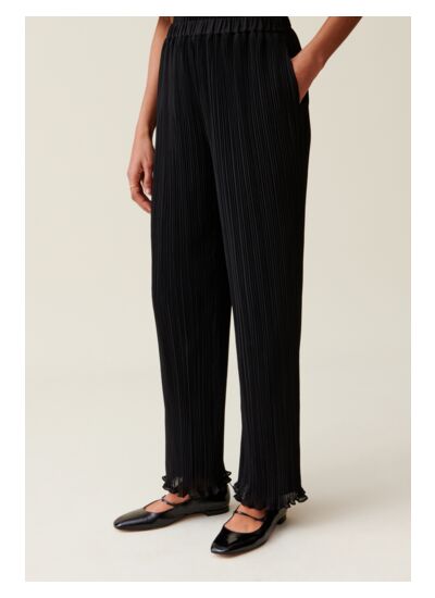 Pantalon noir fluide à taille normale élastiquée avec jeu de plissés et finitions volantées en bas de jambes