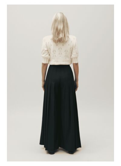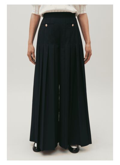 Ce pantalon plissé ample bleu marine de Claudie Pierlot est-il adapté à toutes les morphologies ? Oui, sa coupe ample et ses plis apportent du volume tout en fluidité, ce qui équilibre les silhouettes variées et offre un confort optimal.