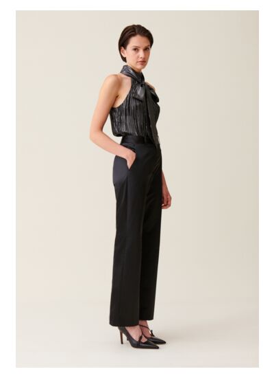 Peut-on porter ce pantalon en dehors du bureau ? Absolument, sa finition satinée et sa couleur noire en font une pièce polyvalente, idéale pour des occasions formelles comme décontractées, selon les accessoires et le haut choisis.
