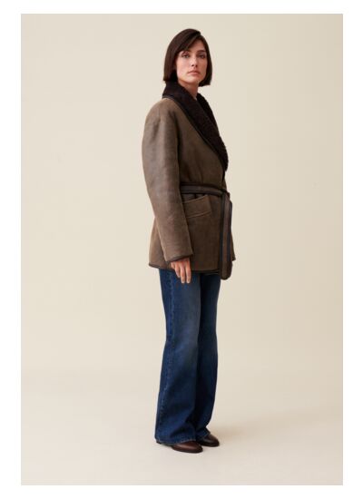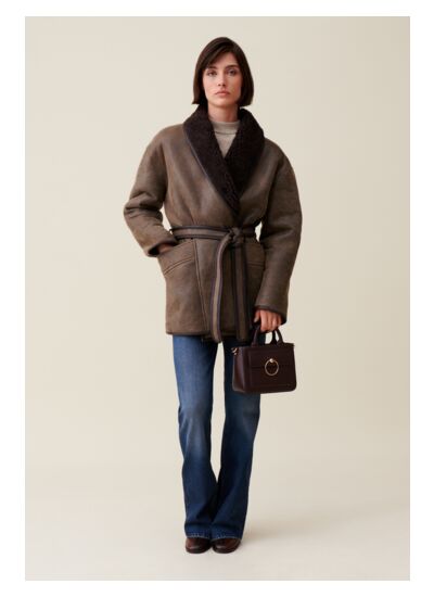 Peignoir en peau lainée taupe avec ceinture et col châle en fourrure