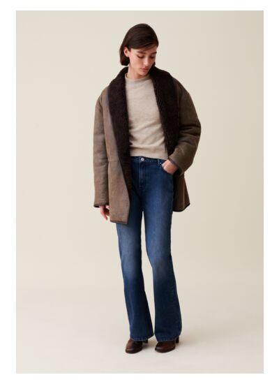 Quelle est la matière principale de ce manteau Claudie Pierlot ? Ce manteau est confectionné en peau lainée, offrant une chaleur naturelle et un confort optimal tout en conservant un aspect élégant et sophistiqué.