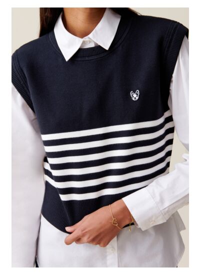 Comment entretenir ce pull rayé sans manches ? Pour préserver la qualité du tissu et les couleurs, il est recommandé de le laver à la main ou en cycle délicat à basse température. Évitez le sèche-linge pour conserver la forme et la texture.