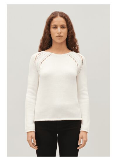 Jeux de broderies échelle aux épaules, finitions roulotées en bas de manches et en bas de pull