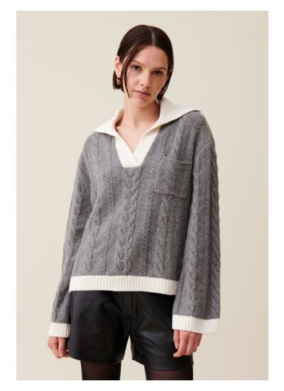 Pull gris clair en maille épaisse avec jeu de torsades et finitions contrastées