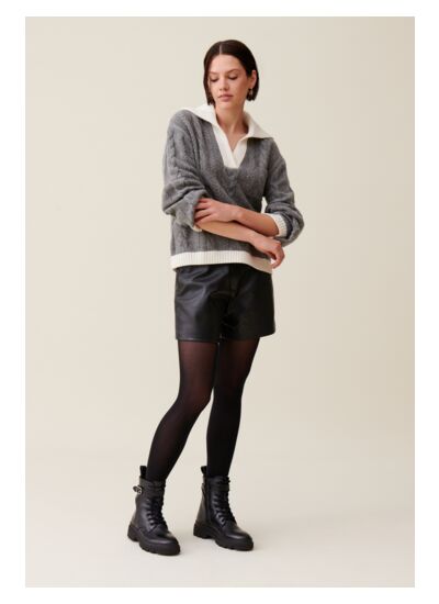 Ce pull torsadé Claudie Pierlot est-il adapté aux saisons intermédiaires ? Oui, sa maille moyenne et son col polo contrasté en font une pièce idéale pour le printemps et l’automne, offrant chaleur sans surchauffe. Comment entretenir ce pull pour préserver sa qualité ? Il est recommandé de le laver à la main ou en cycle délicat à basse température, puis de le faire sécher à plat pour conserver la forme et la texture des torsades. Quelle coupe propose ce pull et comment le porter ? Sa coupe ajustée valorise la silhouette tout en restant confortable. Il s’accorde parfaitement avec un jean ou une jupe pour un look casual chic. Ce modèle convient-il à tous les styles ? Oui, son design classique avec une touche moderne grâce au col contrasté s’adapte aussi bien à un dressing minimaliste qu’à une garde-robe plus audacieuse. Ce pull Claudie Pierlot est-il facile à intégrer dans une garde-robe capsule ? Absolument, sa polyvalence et son élégance intemporelle en font un basique de qualité, facile à associer avec d’autres pièces clés.