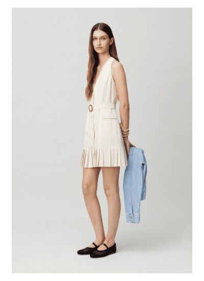 Quelle est la coupe de cette robe Claudie Pierlot ? Cette robe courte est cintrée à la taille pour souligner la silhouette, avec un plissé élégant qui apporte légèreté et mouvement à la matière.