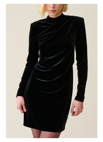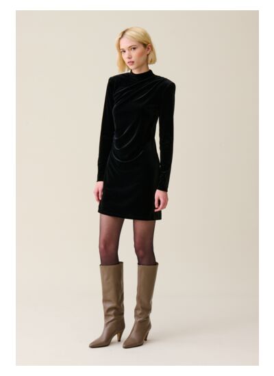 Cette robe courte cintrée en velours noir offre-t-elle un bon maintien ? Oui, sa coupe cintrée met en valeur la silhouette tout en assurant un maintien confortable grâce à sa structure adaptée. Quel style peut-on associer à cette robe Claudie Pierlot ? Elle s’adapte parfaitement à un look chic et moderne, idéale pour une soirée ou un événement élégant, à porter avec des escarpins ou des bottines fines. Comment entretenir cette robe en velours noir ? Il est recommandé de suivre les instructions d’entretien sur l’étiquette, généralement un lavage délicat ou un nettoyage à sec pour préserver la texture et la couleur du velours. Cette robe convient-elle à toutes les morphologies ? Sa coupe cintrée est pensée pour souligner la taille, elle convient particulièrement aux silhouettes en sablier ou fines, mais peut aussi s’adapter à d’autres morphologies selon le style recherché. Quels sont les avantages de choisir une robe Claudie Pierlot ? Claudie Pierlot garantit une qualité de fabrication soignée, des matériaux nobles et un design intemporel qui allie élégance et confort pour un dressing raffiné.