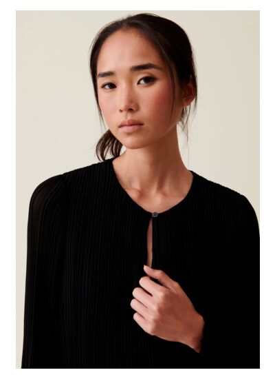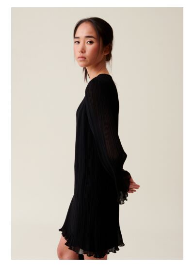 Robe noire courte plissée à manches longues fluides et col rond fermé par un bouton