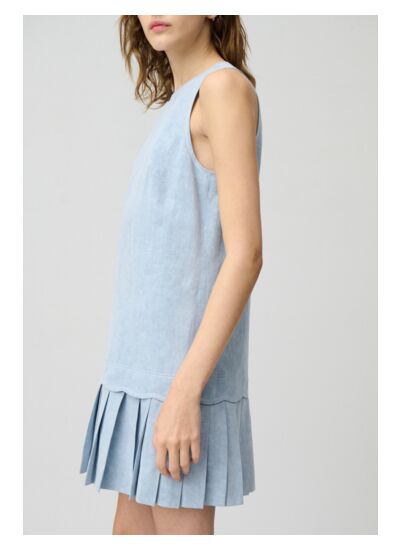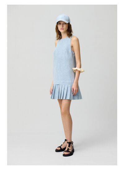 Robe courte sans manches à col rond avec jupe à plis plats et finitions arrondies
